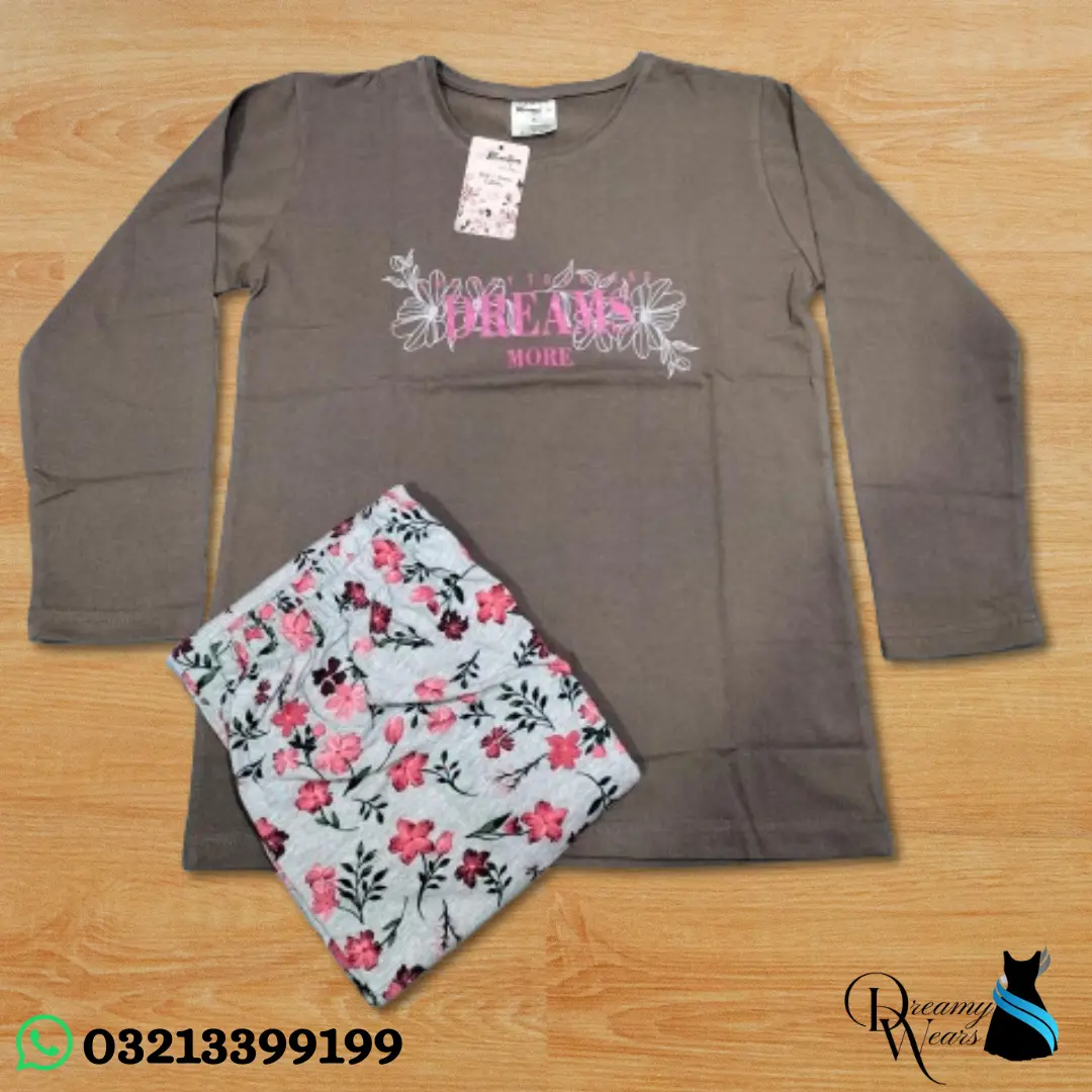 Let your little girl drift off in style with the chic and cozy “Dream More” brown floral nightwear set. Offering a blend of elegance and comfort, this set is perfect for bedtime and lounging.