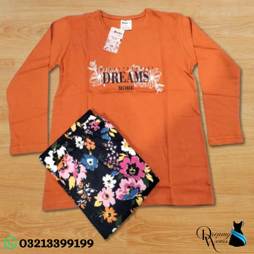 Brighten up bedtime with the vibrant and cheerful “Dream More” orange floral nightwear set. This stylish and comfortable set is designed for girls who want to relax in style while staying cozy. Here’s what makes this set special: