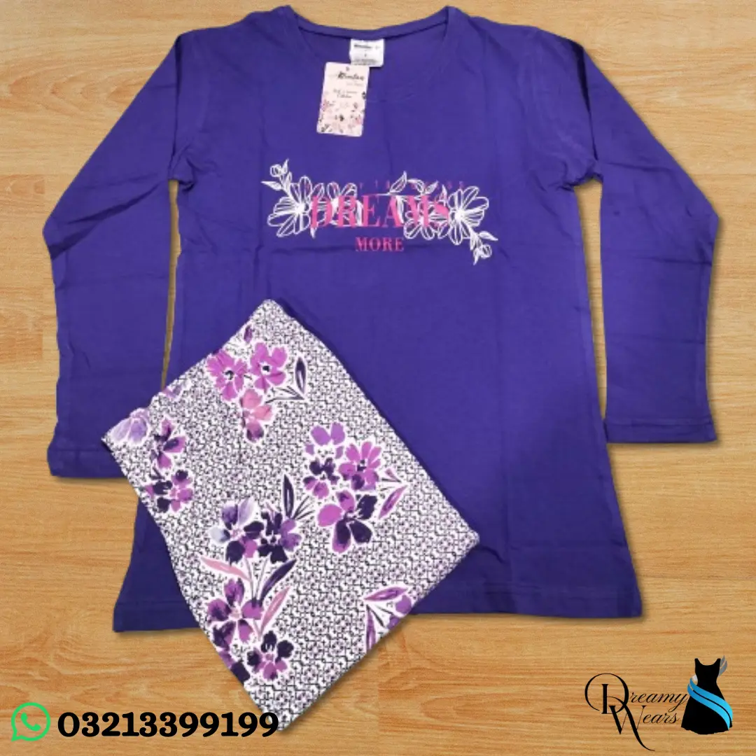 Let your dreams blossom with the “Dream More” violet floral nightwear set, designed for girls who love comfort and flair. This set features: